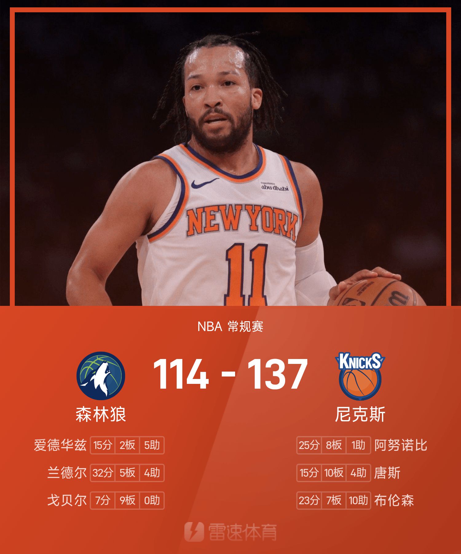 บรันสันทำคะแนน 23 แต้ม 7 รีบาวน์และ 10 แอสซิสต์ และแรนดัลล์ทำ 32 แต้ม