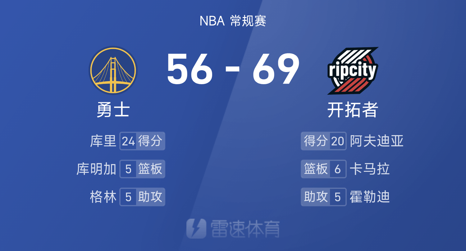 ช่วงพักครึ่ง NBA: ยาง แฮนเซ่น ยิง 0 จาก 1 นัด มี 1 รีบาวด์ และ 1 ผิดพลาด เคอร์รี่ ทำ 24 แต้ม โดยมี 3 พอยน์เตอร์ 5 ครั้ง เทรลเบลเซอร์ส 69-56 วอร์ริเออร์ส