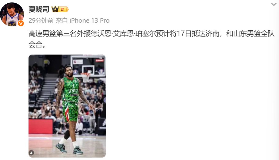 ข้อความต้นฉบับจากโซเชียลมีเดีย: "ความช่วยเหลือจากต่างประเทศครั้งที่สามของทีมบาสเกตบอลชายซานตง Devon Aikun Purcell คาดว่าจะมาถึงจี่หนานในวันที่ 17 และเข้าร่วมทีมบาสเกตบอลชายซานตง"