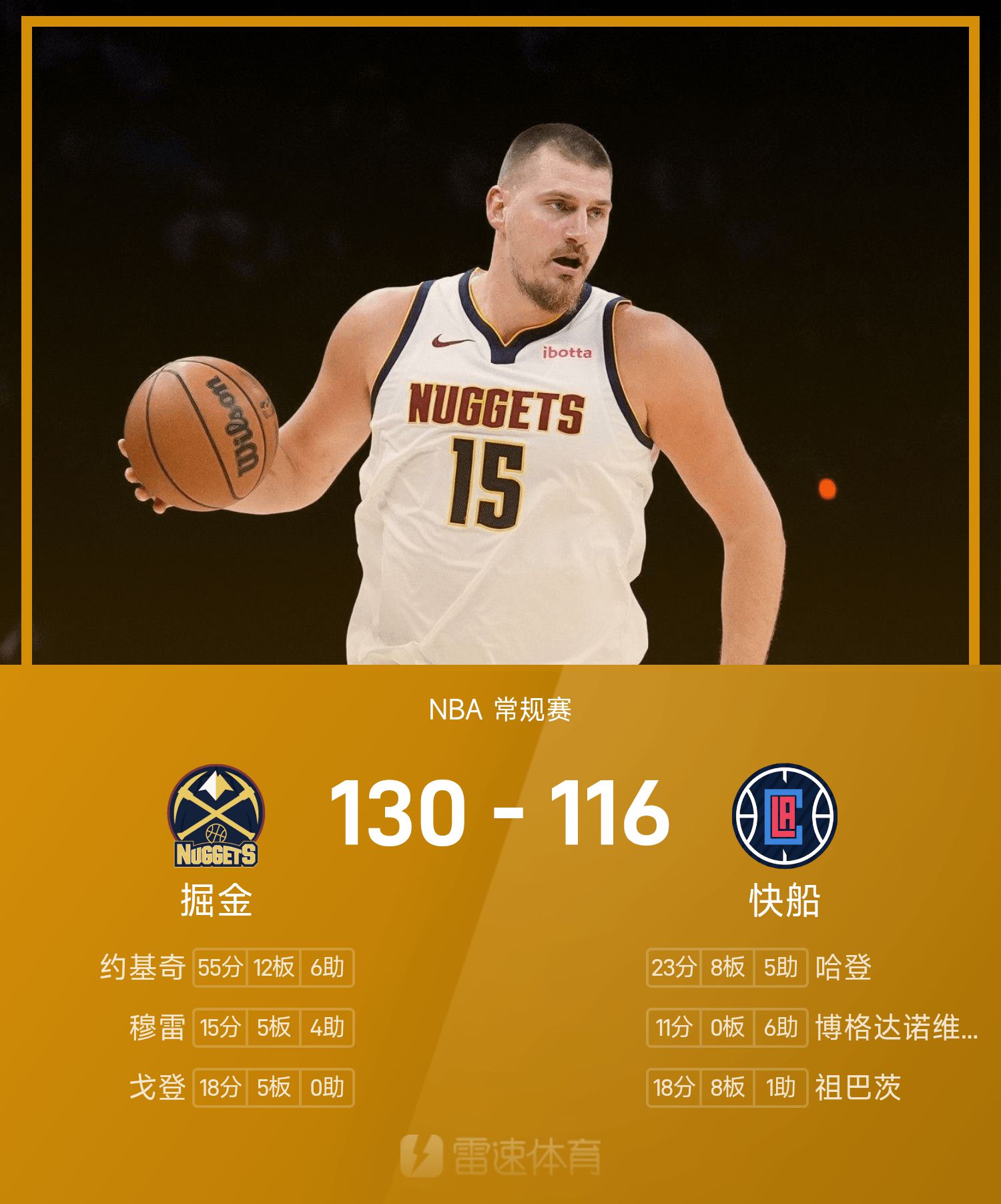 รายงานเกม NBA โยคิช 55 แต้ม 12 รีบาวด์ 6 แอสซิสต์ นักเก็ตส์ เอาชนะ คลิปเปอร์ส 130-116