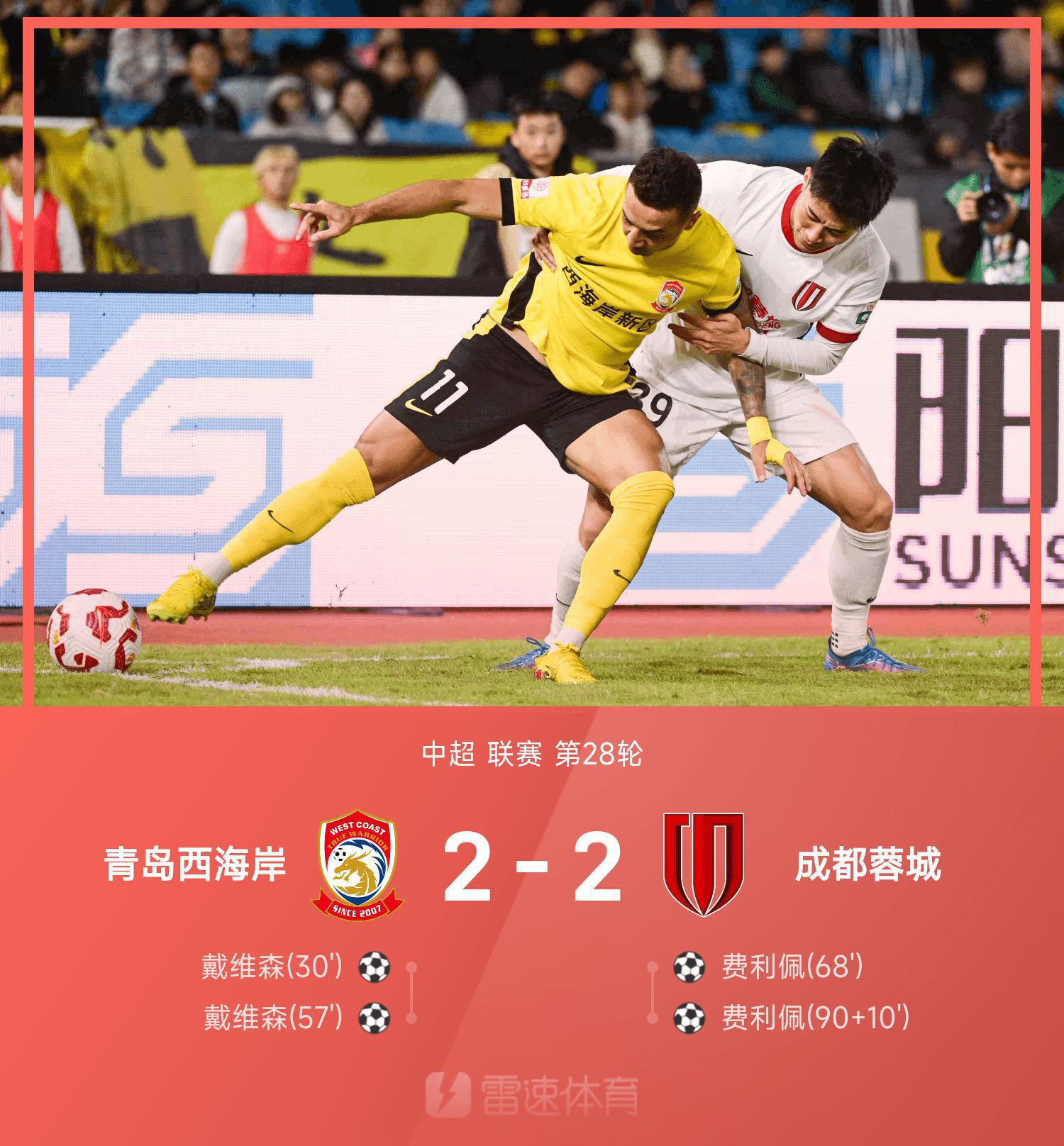 รายงานการแข่งขันไชนีสซูเปอร์ลีก : เฟลิเป้ แหวนคู่ + นับถอยหลังเสมอกัน ชิงเต่า เวสต์โคสต์ 2-2 เฉิงตู เฉิงตู