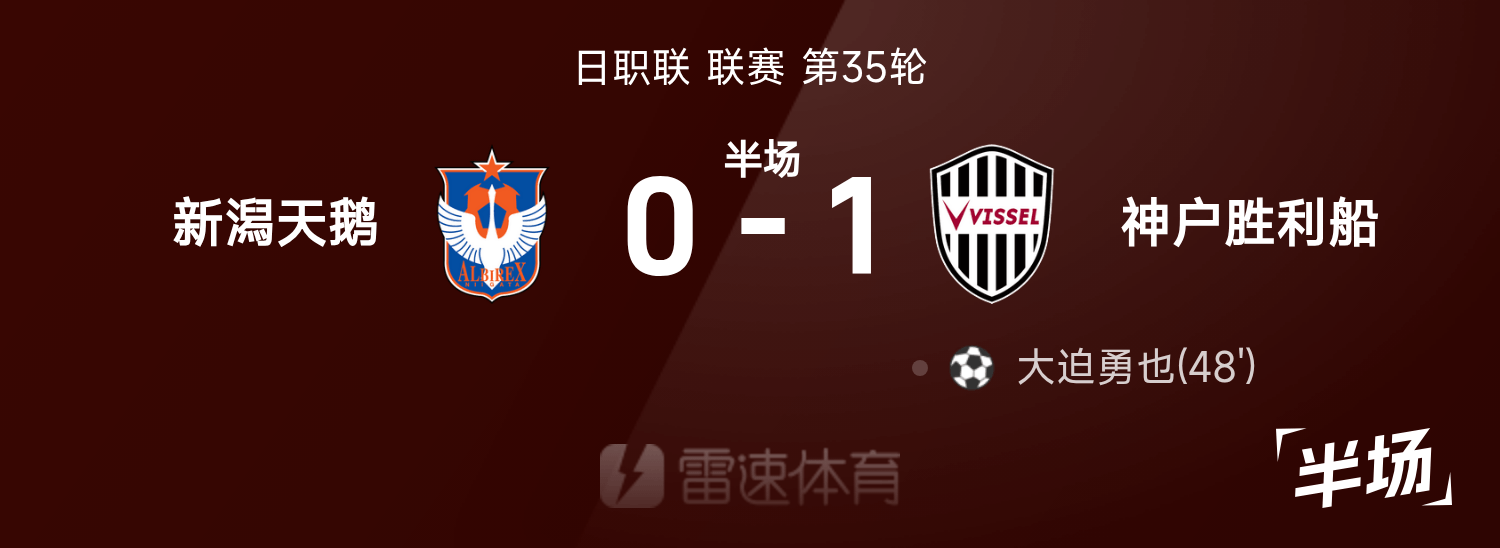 พักครึ่งลีกอาชีพญี่ปุ่น : อิซามุ โอซาโกะ ยิงประตูช่วงทดเวลาบาดเจ็บ, นีงาตะ หงส์ชนะชั่วคราว 0-1 โกเบ