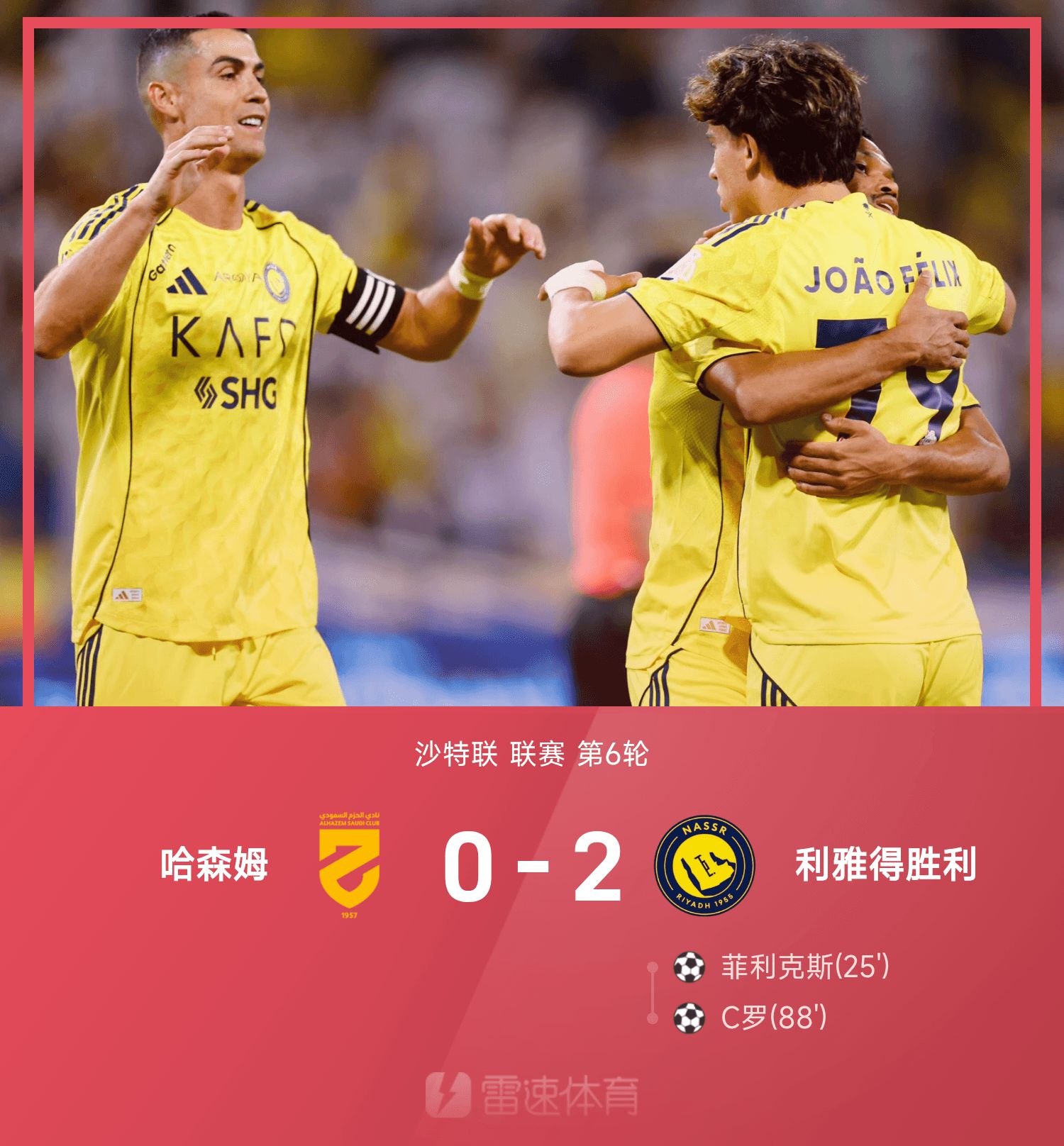 6686 Sports วันที่ 26 ตุลาคม ในรอบที่หกของลีกซาอุดิอาระเบีย 25/26 ริยาดเอาชนะฮาชิม 2-0 ครึ่งแรกเฟลิกซ์โหม่งบอลให้พังทลาย ก่อนจบครึ่งหลัง ลูกยิงของ โรนัลโด้ ตอกย้ำชัยชนะ ในท้ายที่สุดริยาดเอาชนะทีมเยือน 2-0 กับฮาชิมและชนะ 6 นัดติดต่อกันในลีก