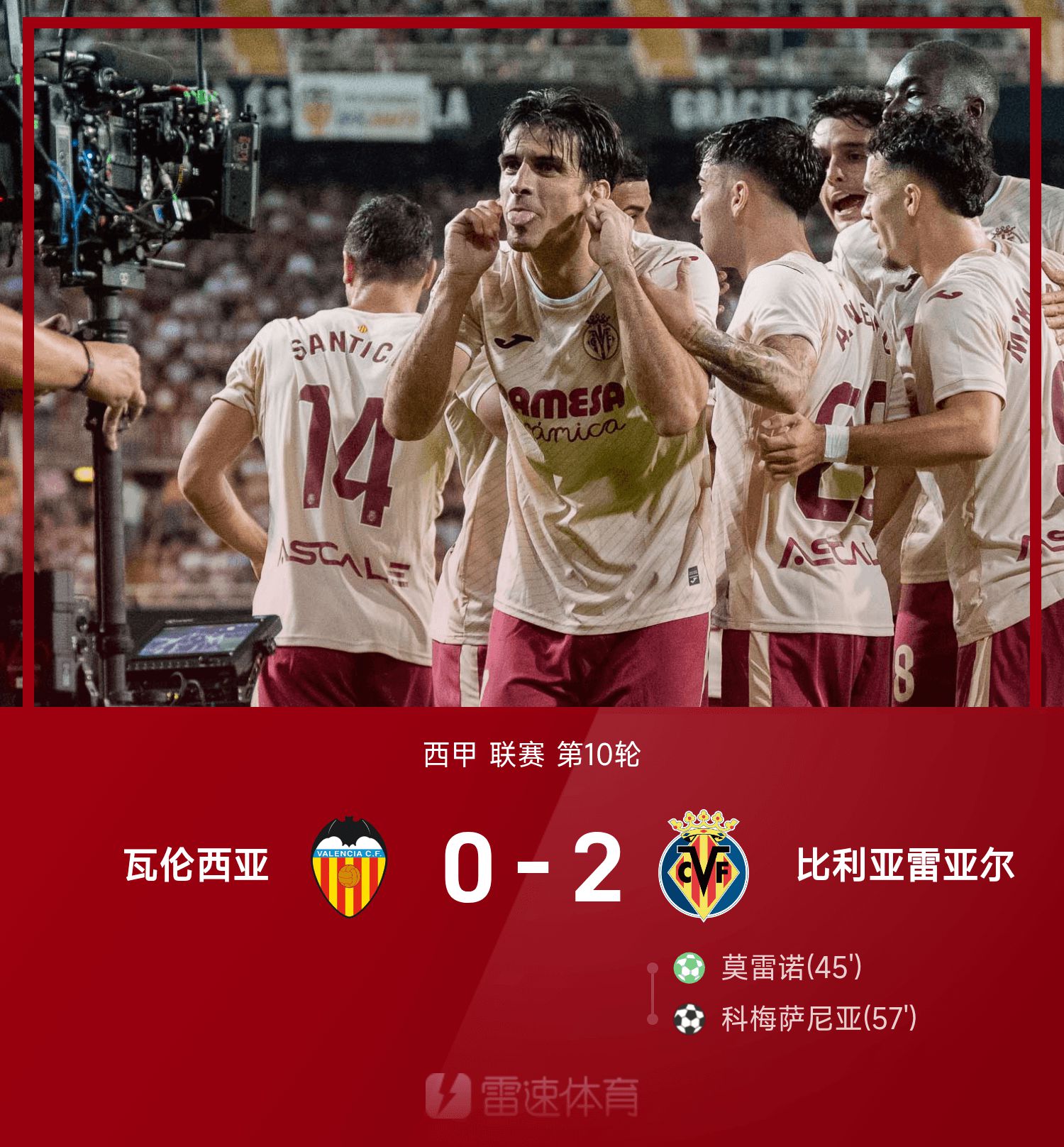 6686 ข่าวกีฬาวันที่ 26 ตุลาคม ในรอบที่ 10 ของฤดูกาลลาลีกา 25/26 บียาร์เรอัลเอาชนะบาเลนเซีย 2-0 ในนาทีที่ 45 โมเรโนทำแต้มและยิงจุดโทษด้วยตัวเองโดยทำประตูที่ 300 ของเกม; นาทีที่ 57 มาซาญญาตามมาด้วยการยิงประตูปิดชัย