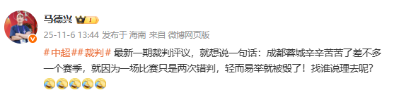 6686 Sports News เมื่อวันที่ 6 พฤศจิกายน นักข่าวกีฬา Ma Dexing กล่าวบนโซเชียลมีเดียว่าฤดูกาลทำงานหนักของเฉิงตู เฉิงตูถูกทำลายด้วยการตัดสินที่ผิดสองครั้ง
